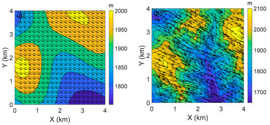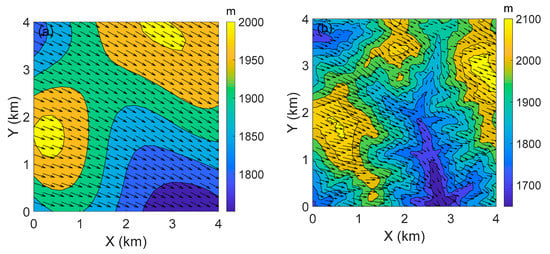 Topography (m) and near-ground (10 m AGL) wind vectors (m/s), 16:00 on 22 May 2018: (a) WRF simulation; (b) WRF-CFD simulation.