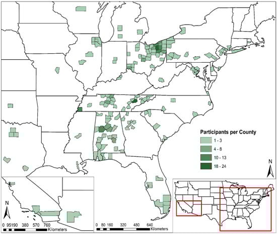 The values from each of the six metrics are summed for each county to produce an overall risk score, which summarizes the participant’s perception of past tornado activity (Table 2.) The risk scores were then manually scanned for natural break points to divide categories with careful consideration given to demote or promote certain counties into a different classification based on particular circumstances and a comparison with previous significant tornado activity research []. For example, the SV/TD metric was used to demote three counties with high risk scores to moderate risk. Dare County, North Carolina is a small coastal county that had 27 tornado days with only three strong tornadoes and no violent tornadoes. It is frequently affected by coastal waterspouts and also hurricane spawned tornadoes of low intensity resulting in no fatalities and 17 injuries in its history. Likewise, Union County, New Jersey is a small and densely populated county with no strong or violent tornadoes in its history, so it was demoted to moderate risk. Broward County, Florida is a large densely populated coastal county with no strong or violent tornadoes in its history so it was also demoted to moderate risk. The natural break between the high and moderate risk counties occurred between risk scores of 2.38 and 2.31, leaving 14 counties as high risk. The moderate, enhanced, and slight categories have equal sample sizes of 33 counties. The marginal category was the largest with 48 counties. In order to conserve space, only the high risk counties are shown in Table 2. The spatial distribution of county risk categories aligns well with research that has identified the most dangerous tornado risk areas for the USA [] (Figure 2).