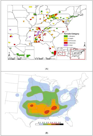 (A) County level risk categories. (B) Average annual number of significant (F2-F5) tornado initiation-locations within 40 km (25 mi) of a point for the 1973–2011 period, adopted from Ref. [] © American Meteorological Society. Used with permission.