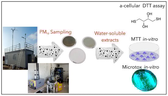 The methodology used for sample analysis is schematized in Figure 1. Water-soluble fraction of PM10 was obtained, using the whole filter, in 10 mL ultrapure water (Milli-Q) in an ultrasonic bath using four cycles of sonication for a total of 80 min. Successively, the extracts were filtered using PTFE membranes. Three aliquots of each extract were used for the assessment, respectively, of the ecotoxicological potential of PM10 using the Microtox® test, of the cytotoxicological potential using the MTT assay, and of the oxidative potential using the DTT (Dithiotreitol) assay. This approach guarantees the comparability of the outcomes of the different assays; all of them start from the same water soluble extract.