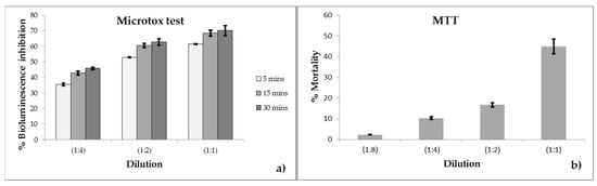 (a) Microtox text results for different exposure times and different dilutions executed on sample 1 (25/11/2017). (b) MTT results for different dilutions of the extract of the same sample.