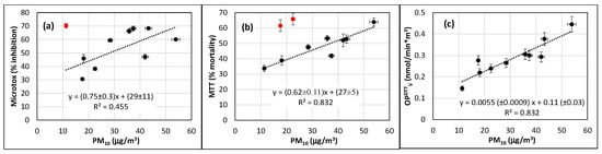 (a) Correlation of Microtox text results for with PM10 concentrations. (b) Correlation of MTT results with PM10. (c) Correlation of OPDTTV and PM10. Samples out of trends are highlighted in red. The graphs include linear fits done excluding samples out of trends.