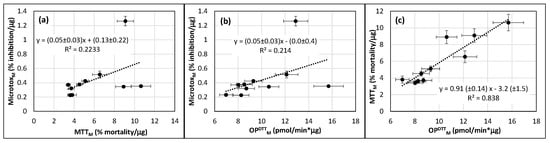 As mentioned in the previous paragraphs the endpoints of the toxicity bioassays are likely sensitive to different chemical and physical properties of PM. In Figure 4a, the results of Microtox inhibition and of MTT mortality, normalized by the PM10 exposure mass, are compared. Results show a statistically not significant correlation. Normalized Microtox results are compared to intrinsic OPDTTM, showing a weak (statistically not significant) correlation (Figure 4b). Instead, there was a clear correlation (Pearson 0.91, p < 0.05) between normalized MTT results and OPDTTM (Figure 4c), suggesting that likely similar factors influence the capacity of PM to induce ROS and the reduced mitochondrial functionality, cell damage, and death as measured by the MTT test.