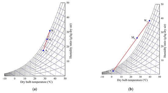During cooling tower operations, the ambient air introduced by the axial fan installed at the outlet of the cooling tower is warmed and humidified, owing to the high temperature of the circulating cooling water. Consequently, the tower outlet air and the ambient air are mixed, as indicated by the red line, A0–B0, in the enthalpy—Humidity chart shown in Figure 1, where the symbols A0, B0, and M0 denote ambient, tower outlet, and mixing air states, respectively. When the tower outlet air and ambient air are mixed, regardless of the changes induced in the mixing ratio, the mixing point will remain on the A0–B0 line. However, it is noteworthy that changes to the working conditions would shift the mixing line A0–B0 to a different region. As shown in Figure 1a, under summer working conditions, the mixing line remains within the unsaturation region, whereas it would shift toward the supersaturation region during winter, as shown in Figure 1b.