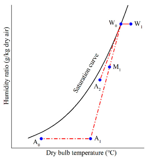 The principle of coupling technology is shown in Figure 6. The ambient air outside the tower at A0 flows into the cold channel, whereas the hot moist air at W0 flows into the hot channel. Subsequently, their heat is exchanged using a surface-type heat exchanger, and therefore, the hot moist drops to W′ along the saturation curve. Simultaneously, the ambient air moves to A1 by sensible heating. The condensed water is produced during the process of reducing humidity ratio, which is collected to save water. Next, the dry air at A1 and moist air at W′ are mixed above the surface type heat exchanger; temperature and humidity ratio are further reduced, and the mixing point M1 falls into the unsaturation region. In this manner, the formation of a plume at the outlet of the cooling tower could be avoided.