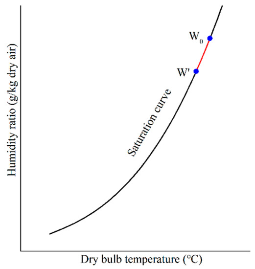 The surface-type heat exchanger is shown in Figure 5, with saturated moist air in its inlet of the hot channel and dry air after heat exchange in the cold channel. Its state drops from W0 to W′ along the saturation curve. During the condensation of moist air, the mass flow rate of dry air remains constant, owing to no mass transfer between moist and dry air. Only the mass of water vapor in the moist air changes; therefore, the amount of condensed water could be calculated using the change in the humidity ratio of moist air. The humidity ratio, d, is expressed as: