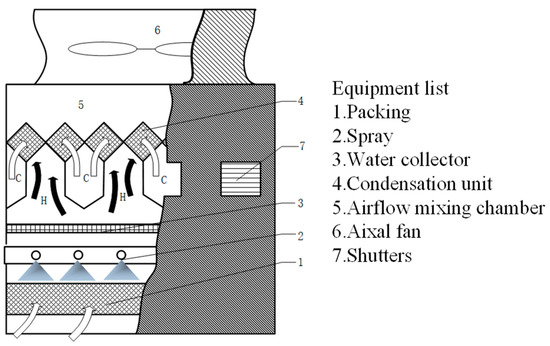 Figure 4 presents the schematic diagram of a cooling tower designed for the coupling technology. In the cooling tower, a surface-type heat exchanger is set above the water collector. The surface-type heat exchanger consists of an array of heat exchange components, each of which is composed of multiple cold and hot channels in an alternate manner.