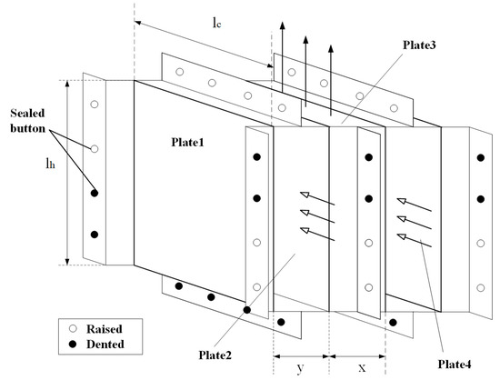 Figure 5 shows the schematic diagram of a heat exchanger unit. Here, symbols lh, x, lc, and y refer to the length of hot channel, the width of single hot channel, the length of cold channel, and the width of single cold channel, respectively. Hollow and solid arrows indicate cold air flow and hot air flow, respectively. Each heat exchange channel consists of two heat exchange plates. The sealed heat exchange channel consists of four heat exchange plates, which can be straight or corrugated.
