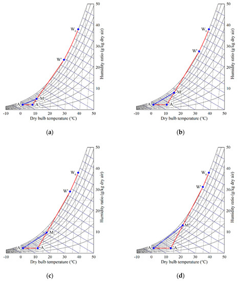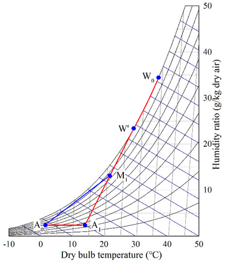 We next determined the state point, A1. Because there is no mass transfer between the two flows, the absolute humidity at the cold channel outlet equals to that at the cold channel inlet. Using the heat balance equation, we can also calculate the specific value of W′, which is hot moist air after condensation. Hot moist air mixes with the heated dry air directly, and therefore, the state point, M1, can be obtained as follows: