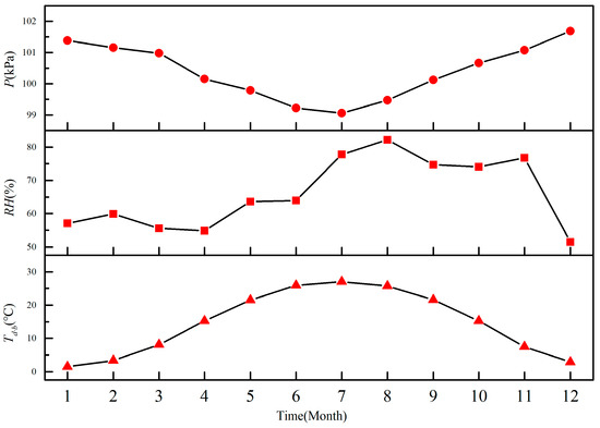 Figure 7 shows the parameters of a typical meteorological year, including atmospheric pressure (), relative humidity (), and dry bulb temperature (). The meteorological parameters of Zhengzhou were obtained from the China standard weather database (CSWD).