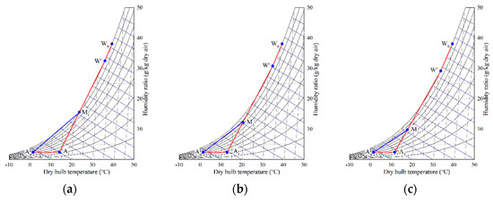 To ensure there is no visible plume above the cooling tower, it is important to select appropriate N values during the operation. We have already obtained some specific parameters that are listed in Table 2. The thermodynamic processes are illustrated in Figure 8 with different numbers of heat exchanger units (N = 4, 6, and 8). The new mixing line A0–M1 falls into the supersaturation region; as N increases, M1 tends to A1 and the mixing line grows shorter and tends to fall into the unsaturation region, and the possibility of plume generation is gradually reduced.