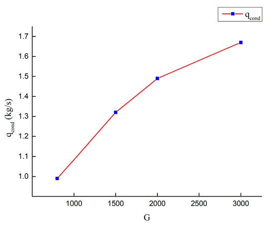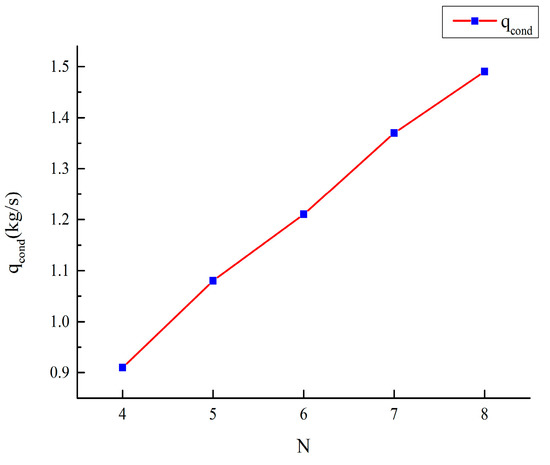 The relationship between N and is shown in Figure 9; it can be seen that the amount of condensed water increases with the increase of N value, and they are almost in direct proportion. Therefore, taking into consideration the cost-effectiveness and safety of the operation, N = 8 is recommended at , , and .