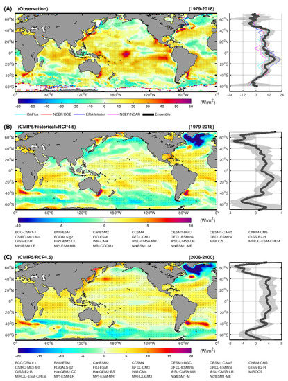 Linear trend of ocean surface turbulent heat fluxes (THF, positive upward). The datasets and models used to derive the results are listed below each panel. (A) Observational trend of THF during 1979–2018 based on four THF datasets. The ENSO (El Nino-Southern Oscillation) signal has been removed before calculating the linear trend. Stippling indicates region where the trend pass a 95% confidence level (Student’s t-test). The right panel gives the zonal mean profile of THF trend. Grey shading illustrates the standard deviation of THF variations. The coloured lines present the THF trend from individual datasets. (B) Simulated trend of THF based on the CMIP5/historical (1979–2018) experiment. Since historical experiment only covers the period until 2005, the results are extended into 2018 based on the CMIP5/RCP4.5 experiment. Stippling illustrate region where at least 2/3 of the models agree on the sign of the trend. The right panel gives the zonal mean profile of THF trend. Grey shading illustrates the standard deviation of model projections. (C) is similar to (B), but the results are based on the CMIP5/RCP4.5 experiment (2006–2100).