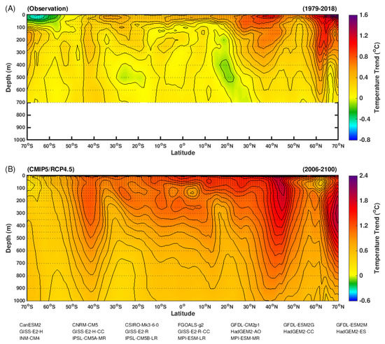 Vertical distribution of zonal mean ocean temperature trend. (A) Observational result based on the Global Ocean Heat and Salt Content dataset (1979–2018) [24]. The stippling indicates region where the trend pass 95% confidence level (Student’s t-test). (B) multi-model ensemble trend of ocean temperature. Results based on multi-model simulations under the CMIP5/RCP4.5 scenario (2006–2100). Stippling indicates regions where the trends are stronger than two times of the standard deviation of the internal variability.