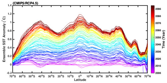 Multi-model ensemble zonal mean sea surface temperature anomaly (in comparison with the SST ( sea surface temperature) between 2006–2010) under the CMIP5/RCP4.5 scenario. The coloured lines represent individual years.