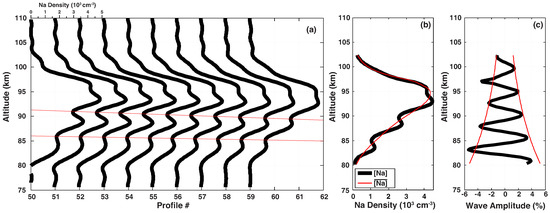 (a) Observed sequence of sodium density profiles taken on 30 May 1996 by a Na lidar system. The descending phase of the wave is indicated by the straight red lines. (b) A single Na density profile superposed by an estimated background profile. (c) Wave amplitude obtained from (b). Notice in (c) the continuous red line wave envelope indicating the wave amplitude decreasing with altitude, i.e., .