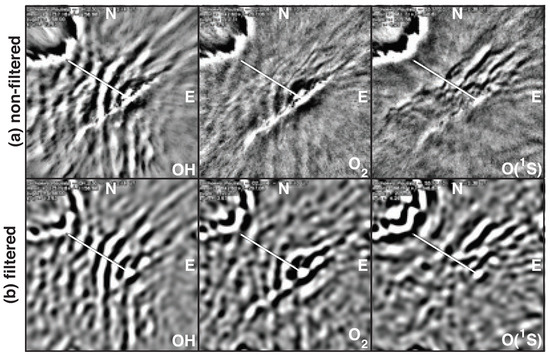 By applying the procedure above to the images in Figure 2, we have obtained the following parameters for the observed gravity wave event: horizontal wavelength of ∼40 km, period of ∼30 min, propagation direction of 160, apparent phase speed of ∼20 m/s, and amplitude of 15%, 7%, and 5% in OH, O, and O () layers, respectively, indicating a dissipative wave with km. We refer the reader to the work of [17,18] to find out more details of how wave parameters are derived from the cross-spectral analysis of airglow images.