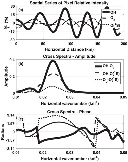 The wave amplitude is obtained for a given nightglow layer by extracting relative intensity along a straight line drawn perpendicularly to the wave fronts (see Figure 2). These spatial series’ of pixel intensities of each layer can be seen in Figure 3a. Each pair of series are then subjected to cross-spectral analysis from where amplitude and phase periodograms are obtained. Figure 3b,c show the amplitude and phase periodograms of the spatial series showed in Figure 3a. The uncertainty in the wave amplitude is less than 20% according to calculations of [15]. As the layers peak at different altitudes and their separation () is a significant fraction of the wave’s vertical wavelength, a finite phase difference is expected to be measured in the phase cross-spectra. The uncertainty in is 50% based on the work of [15] as well.
