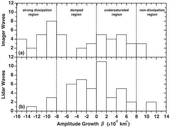 Figure 4 shows histograms for the amplitude growth rate () for waves observed in both imager and lidar data. Positive values of indicate amplitude amplification with increasing altitude, while negative values refer to decay of the wave amplitude with increasing altitude. Values of show that the amplitude does not change as the wave propagates upward (saturated wave), while events presenting 8 km are nondissipating (freely propagating) waves as their amplitude e-folds every 12 km [3]. Finally, waves presenting km decay in amplitude rapidly (strong dissipation), losing more than 64% of their original energy within 12 km distance.