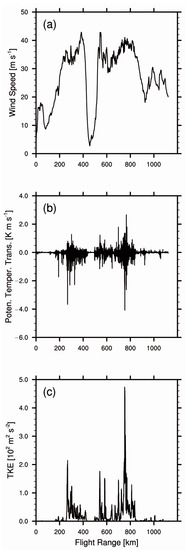 Observations from J41 can describe tropical cyclone structures from synoptic scale to turbulence because of the high temporal resolution of AIMMS20. To illustrate multiscale structures in aircraft observations, we computed several diagnostics based on 30 s moving average. The mean value is computed by 30 s moving average, denoted by an overbar, and its fluctuating value is denoted by a superscript prime. Then, vertical turbulent flux of potential temperature, denoted by T, and turbulent kinetic energy, denoted by TKE, are computed by Equations (1) and (2), respectively.