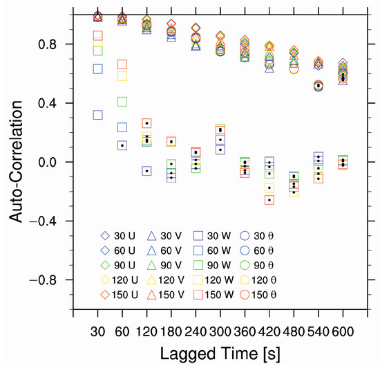 Several time lagged autocorrelations after 30, 60, 90, 120, and 150 s moving average. Hollow diamonds, squares, triangles, and circles represent u wind, v wind, w wind, and potential temperature, respectively. Black dots mean reject by 99% confidence.