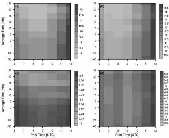 To examine the best time to assimilate aircraft observations, the root mean square errors (RMSEs) computed between the priors and averaged horizontal wind are shown in Figure 4. It is found that the minimum RMSEs occur at 0800 UTC regardless of the time interval of the arithmetic mean (Figure 4a,b). In contrast, minimum RMSEs for temperature and pressure could be at either 0800 or 0900 UTC, even at 0700 UTC for pressure, which depends on the time interval (Figure 4c,d). Therefore, we can conclude that u and v wind are more consistent with priors than temperature and pressure. Furthermore, to avoid deformation of the tropical cyclone’s circulation, we assimilated u and v wind at 0800 UTC.