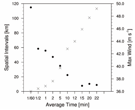 Spatial intervals (crosses; unit: km) and maximum winds (dots; unit: m s−1) of aircraft observations averaged over different time intervals.