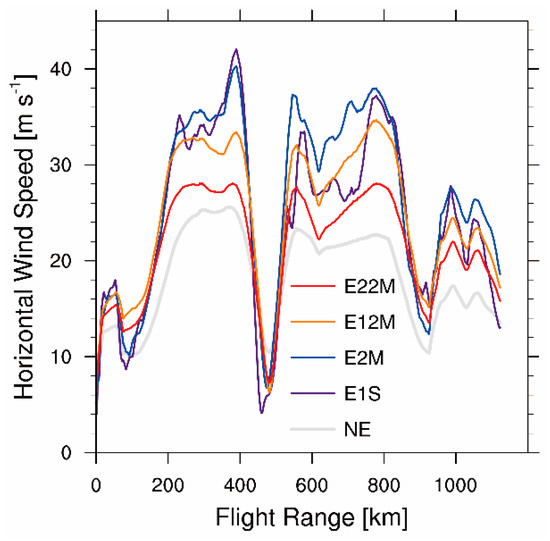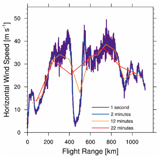 Distributions of horizontal wind speeds (m s−1) along the flight path. The purple, blue, orange, and red lines represent the aircraft observations averaged over 1 s, 2 min, 12 min, and 22 min, respectively.