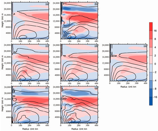 Azimuthally averaged vertical cross-sections of tangential (black contours; unit: m s−1) and radial (shaded; unit: m s−1) wind at the analysis time computed by the posterior ensemble means in experiment (a) NE, (b) E1S, (c) E2M, (d) E12M, (e) E22M, (f) E1S_qc2, and (g) E1S_err.