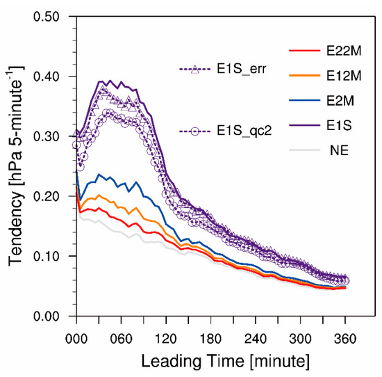 Two sensitivity experiments were conducted to evaluate the effects of decreasing the quality control threshold and changing the observational error from assimilating the aircraft observations. Compared to experiment E1S, the averaged RMSEs for u and v wind are higher in experiment E1S_qc2 but lower in experiment E1S_err (Table 3). The risk of poor representativeness in the 1 s average aircraft observations is amplified by decreasing the number of observations in experiment E1S_qc2. However, decreasing the weight of observations by changing the observational errors results in lower RMSEs for u and v wind in experiment E1S_err because of the assumed uncorrelated observational errors in EnSRF. Although the secondary circulations in both experiments E1S_qc2 and E1S_err are contaminated by the sub-grid scale noise and serial correlation in aircraft observations (Figure 8f,g), the imbalance indicated by surface pressure trends was alleviated (Figure 9).