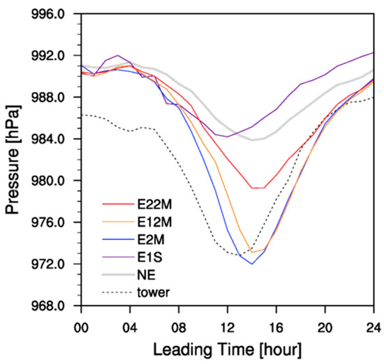 The observed evolution in pressure (unit: hPa) at 50 m altitude at the tower and model-derived evolutions of pressure from experiments NE (gray line), E1S (purple line), E2M (blue line), E12M (orange line), and E22M (red line).