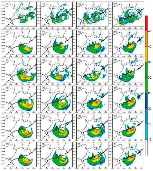 CAPPI (unit: dBZ) at 3 km altitude at (a1) 1100, (a2) 1400, (a3) 1700, and (a4) 2000 UTC on 1 Aug 2016 and model-derived CAPPI in experiment NE (2nd row), E1S (3rd row), E2M (4th row), E12M (5th row), and E22M (6th row).