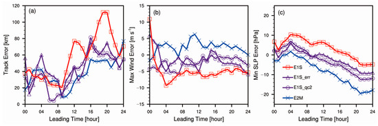Evolution in errors in (a) tracks (unit: km), (b) maximum surface winds (unit: m s−1), and (c) minimum sea level pressures (unit: hPa) computed using simulations after subtracting best track data.