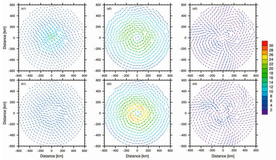 After Fourier decomposition in cylindrical coordinates, the horizontal wind is transferred from tangential and radial wind and interpolated to Cartesian coordinates with a 6-km grid size. The steering flow in experiment NE is southeasterly, driving Typhoon Nida northwestward (Figure 14a1). After assimilating aircraft observations, the steering flow slows and shifts southward over the tropical cyclone center (Figure 14b1), leading to a decreasing track forecast error in experiment E2M. The asymmetric vortex structures in both experiments NE and E2M show a similar pattern, a pair of cyclonic and anticyclonic gyres, the cyclonic gyre to the northeast of Typhoon Nida and anticyclonic gyre to the southwest. Thus, ventilation flow passing the center of Typhoon Nida, between the pair of gyres, also leads the tropical cyclone to the northwest. However, the gyres in experiment E2M rotate anticlockwise around the tropical cyclone center (Figure 14b3), and the cyclonic (anticyclonic) one is located more toward the west (east) with the same intensity; therefore, there is a southward shift in ventilation flow. This evaluation of the steering and ventilation flows thus substantiates the improvement in track forecast shown in Figure 10a,b. In addition, in comparison with experiment NE, E2M shows an approximate 30 m s−1 rotation wind in Figure 14b2, because assimilating aircraft observations strengthens the axisymmetric structure of Typhoon Nida, which is consistent with the improved maximum wind forecast in Figure 10c.