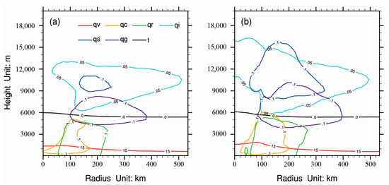 Azimuthally averaged vertical cross sections of mixing ratio (unit: g/kg) of water vapor (red lines), cloud water (yellow lines), rain water (green lines), ice water (light blue lines), snow water (blue lines), and graupel water (purple lines) computed using the posterior ensemble means in experiments (a) NE and (b) E2M. The black lines represent the zero line of temperature (unit: °C).