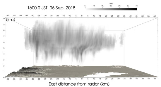 A precipitation cloud observed on 6 September 2018 appeared in a height range from approximately 4 to 10 km, and precipitation was not observed on the ground. This precipitation cloud can be categorized as a virga. The Glossary of Meteorology of the American Meteorological Society (http://glossary.ametsoc.org/wiki/Virga) defines a virga as, “frequently seen trailing from altocumulus and altostratus clouds, but also is discernible below the bases of high-level cumuliform clouds from which precipitation is falling into a dry subcloud layer.” The remote sensing of virgas is often performed using vertical observations by using cloud radar and lidar [8]. Virga-type precipitation systems observed by a spaceborne radar were reported by Wang et al. in 2018 [9], and ground-based radar and range-height indicator (RHI) observations of the anvil portion of the mesoscale convective system (MCS) were reported by Evans et al. in 2011 [10]. There are few continuous observations of three-dimensional structures by polarization radar, and even virga may be extremely hazardous to aviation if colder air is able to descend rapidly. In addition, there are few examples of precipitation observations performed by operational radars, and this is because observations at high elevation angles are typically limited for operation radars. In this paper, we analyzed virga-type precipitation clouds by MP-PAWR to extract dynamic information as well as information regarding the physical characteristics of the clouds using dual-polarization observations.