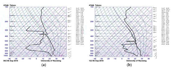 Skew-T diagrams of atmospheric sounding at Tateno at 09:00 JST (a) and 21:00 JST (b) on 6 September 2018. Figures are provided by the University of Wyoming.