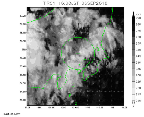 Figure 3 shows a weather map from 09:00 JST on 6 September 2018. In this figure, a stagnation front is shown north of a mesoscale, low-pressure system located to the south of the Islands of Japan. The location of the front was just south of the radar site marked with a (+) sign on the chart. Note that these environmental conditions were generated by a typhoon that passed through the area two days prior. The typhoon became an extratropical cyclone at that time (northeast edge, Figure 3). The sounding data from 09:00 JST and 21:00 JST at Tateno (approximately 50 km east–northeast from the radar site) is shown in Figure 4, illustrating that all layers were dry except for at the altitude ~400 hPa at 09:00 JST (Figure 4a). The upper air became moistened above 600 hPa at 21:00 JST (Figure 4b), and the temperature increased by 3–4 degrees below 800 hPa from 09:00 JST to 21:00 JST. Thus, the moist air in the middle layer and the warm air in the lower layer contributed to the formation of the precipitation. Moreover, the freezing level was about ~5000 m (about 5.0 km at 09:00 JST and 4.9 km at 21:00 JST) throughout the day. The convective available potential energy (CAPE) of 1.04 J/kg, the convective inhibition (CIN) of −377 J/kg, and the lifted condensation level (LCL) of ~1200 m indicated that the convective activity on this day was quite low. Figure 5 shows the brightness temperature of the Himawari-8 IR channel (with a wavelength of 10.4 μm) at 16:00 JST. From this figure, a cloud band with low brightness temperature appeared in the observation range of the MP-PAWR, and the minimum brightness temperature was about 225 K, corresponding to an altitude between 11 km and 12 km from radiosonde data at Tateno. This is an interesting finding because this altitude is 1 to 2 km higher than the maximum height of the radar echo, which will be described later. The cloud band was a mesoscale system with a size of ~500 km long by 40 km wide.