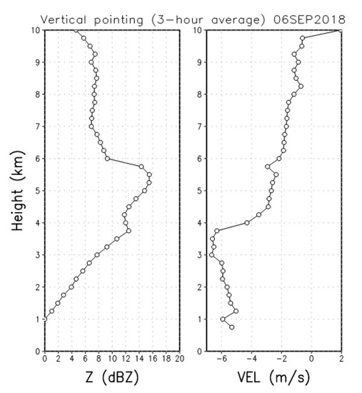 Figure 10 shows a time–height cross section of Z, Vr at a 90-degree elevation angle. First, echoes below the freezing level passed over the radar site only around 16:00 JST, corresponding to the precipitation streak (virga) seen in Figure 1. The Doppler velocity below the freezing level was around 5 m/s, which corresponds to the fall velocity of the raindrops. A peak of Z appeared just above the freezing height in Z. The Doppler velocity starts increasing toward the ground below the freezing height. This feature becomes clear by averaging over time, as shown in Figure 11. The Z profile shows a peak at around 6 km in altitude, which may not correspond to the bright band. Around the freezing height, the appearance of a bright band was not clear, and Z gradually decreased toward the ground, indicating the evaporation of precipitation particles. The Doppler velocity profile is a good indicator of the melting process of the precipitation particles: the Doppler velocity of the nadir direction reflects the fall velocity under weak convection. As seen in Figure 10, the profile below the freezing height only reflects the profiles around 16:00 JST. From the top to the freezing height, the doppler velocity increases from 0.5 m/s to 2.5 m/s downward, which corresponds to the fall velocity of ice and snow particles (2.5 m/s is rather fast compared with the typical fall speed of snow, suggesting the downward air motion). At around freezing height, the Doppler velocity gradually increases, starting at an altitude of around 4.5 km. It increased toward the ground, with a peak (<−7 m/s) at 3.5 km in height. The downward velocity decreased below this height. The profiles of Z and Doppler velocity below the freezing level suggest the precipitation particles evaporated, changing the representative size.
