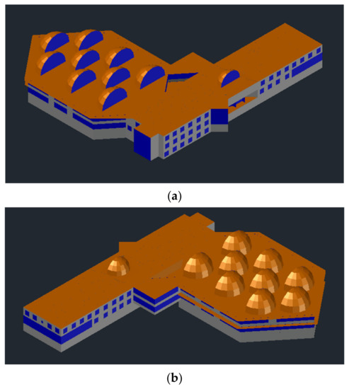 3D library visualization: (a) Northeast view; (b) Southwest view. Blue color is associated with glasses, gray color is associated with walls and orange color is associated with roof and plates.