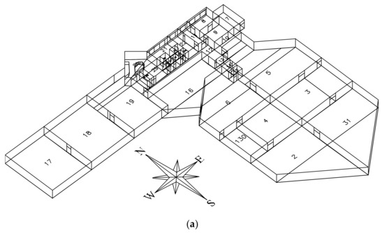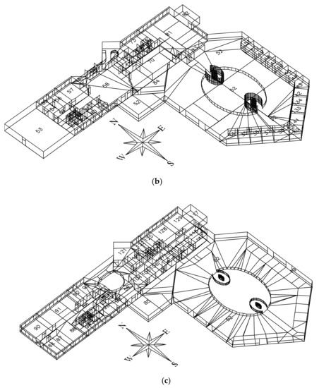 3D visualization of the compartments’ numeration: (a) basement; (b) ground floor; (c) first floor.