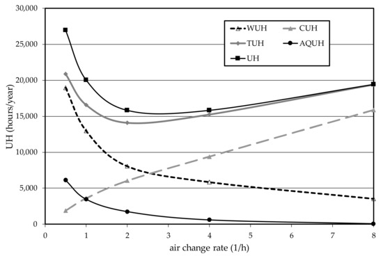 The long-term conditions can be evaluated by the total number of uncomfortable hours (UH), obtained during a year (see Figure 3). Equation (4) shows that the total number of uncomfortable hours is obtained using the sum of the warm uncomfortable hours (WUH), the cold uncomfortable hours (CUH) and the uncomfortable hours due to indoor air quality (AQUH) for each air change rate, considered between 0.5 to 8 per hour. The lowest value is obtained by air infiltration and the highest value can be obtained with the windows and door open [37,38].