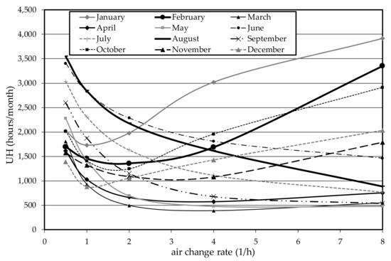 The evolution of the annual total of WUH, CUH, TUH, AQUH and UH as a function of the air change rate are presented in Figure 3, while in Figure 4, the evolutions of each monthly total of UH as a function of the air change rate are presented.