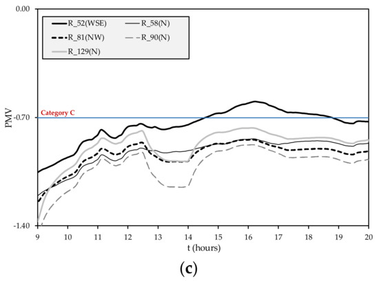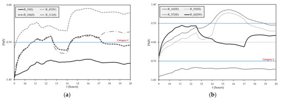 Figure 5 and Figure 6 show N, S, E, W, SE, SW, NW and WSE, presented in the legend, are associated with the windows facing, respectively North, South, East, West, Southeast, Southwest, Northwest and West–South–East directions. Figure 5 and Figure 6 have the blue line represent the limits of PMV within category C [27].