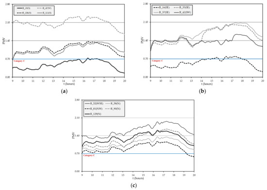 PMV index evolution for a typical summer day for an air change rate of three renewals per hour: (a) Rooms 19, 47, 106 and 111; (b) Rooms 16, 35, 37 and 42; (c) Rooms 52, 58, 81, 90 and 129. N, S, E, W, SE, SW, NW and WSE, presented in the legend, are associated with the windows facing, respectively North, South, East, West, Southeast, Southwest, Northwest and West–South–East directions.