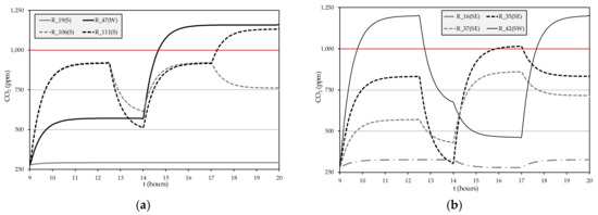 This section presents the evolution of the CO2 concentration in the same compartments where the evaluation of the PMV index is presented. The evaluation of the CO2 concentration is obtained for an air change rate of two per hour (best option) in typical winter conditions and for an air change rate of three per hour (best option) in typical summer conditions. The evaluation of the CO2 concentration can be seen in Figure 7 for winter conditions and in Figure 8 for summer conditions.