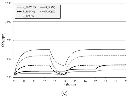 CO2 concentration evolution for a typical winter day for an air change rate of two renewals per hour: (a) Rooms 19, 47, 106 and 111; (b) Rooms 16, 35, 37 and 42; (c) Rooms 52, 58, 81, 90 and 129. N, S, E, W, SE, SW, NW and WSE, presented in the legend, are associated with the windows facing, respectively North, South, East, West, Southeast, Southwest, Northwest and West–South–East directions.