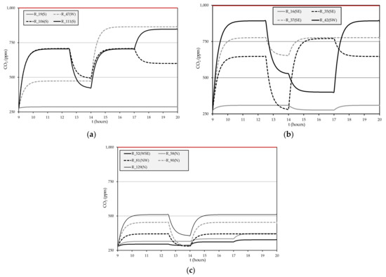 CO2 concentration evolution for a typical summer day for an air change rate of three renewals per hour: (a) Rooms 19, 47, 106 and 111; (b) Rooms 16, 35, 37 and 42; (c) Rooms 52, 58, 81, 90 and 129. N, S, E, W, SE, SW, NW and WSE, presented in the legend, are associated with the windows facing, respectively North, South, East, West, Southeast, Southwest, Northwest and West–South–East directions.
