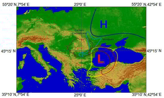 In the cold season (i.e., October–March), the sea is an important source of heat and water vapor, which help the formation and development of cyclones [7,8,9,10]. When a Black Sea cyclone is very intense, and/or when it is in strong contact with a high-pressure field (i.e., of East-European, Azores, or Scandinavian origin), high pressure gradient, and often, temperature gradient is generated. Under these conditions, the wind intensifies in eastern and southeastern Romania. The direction and intensity of this local wind (called “crivăț” in Romanian) depends also on the topography [11,12]. The cold air from northern or northeastern Europe is forced to move between the dynamic dam offered by the Eastern Carpathians and the thermal dam of the Black Sea (Figure 1) [13,14,15,16]. If this intense wind is associated with snow and causes the temporary decrease of visibility, the generated phenomenon is classified as a blizzard [17].