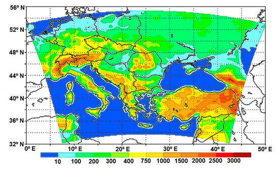 Sensitivity numerical experiments (Table 1) were made using a high resolution, non-hydrostatic regional climate model, RegCM4.5 (MM5: Mesoscale Model version 5 of the Penn State/NCAR dynamical core) [33,34]. The model horizontal resolution is 15 km and has 23 σ-coordinate vertical levels. Physical parametrizations are described in detail by Elguindi et al. [34]. The integration domain and orography of the model are presented in Figure 2 and the initial and lateral boundary conditions were taken from the ERA-Interim (0.75° × 0.75°). The simulation was initialized at 00 UTC on 20 April 2017.